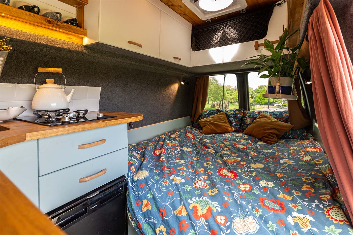 The Swift Camper has been designed to offer a comfy living space and a cosy double bed. The sofa area allows you to sit around a table, or relax with your feet up looking out of the windows at the view. The sofa is then converted into the double bed for sleeping. We have an option for a small over head bed for a toddler up to 3 years.