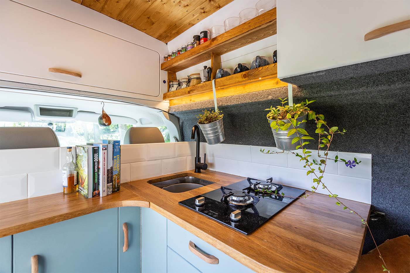 The Swift Camper has been lovingly converted by its owners Matt and Naomi. The high-top Volkswagen Transporter is ideal for a couple or a small family. The camper has loads of storage, as well as a carefully considered living space with a kitchen and fridge. The interior is bright and rustic, offering everything you might need to cook and live within a small camper to enjoy your holiday.