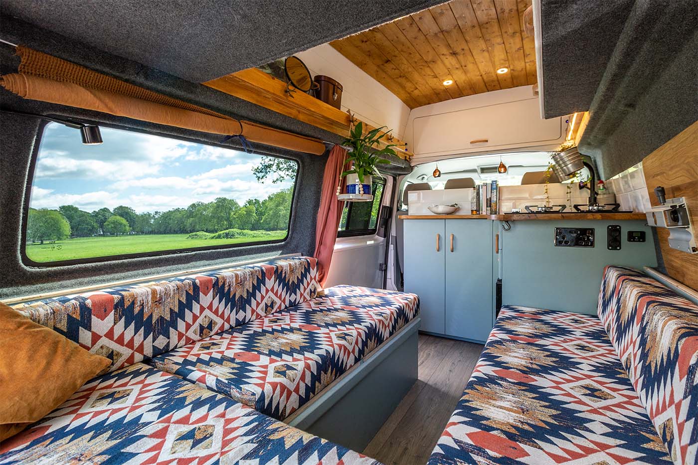 The day set up for the campervan is a comfy sofa in a U shape. There is a table that can pivot to be used in the centre of the seating, or to the side when it is not needed. For traveling, there are three belted seats in the front cab, and a fold away additional seat with a 3 point safety seat belt in the back. If you think you might need this additional seat please let us know.